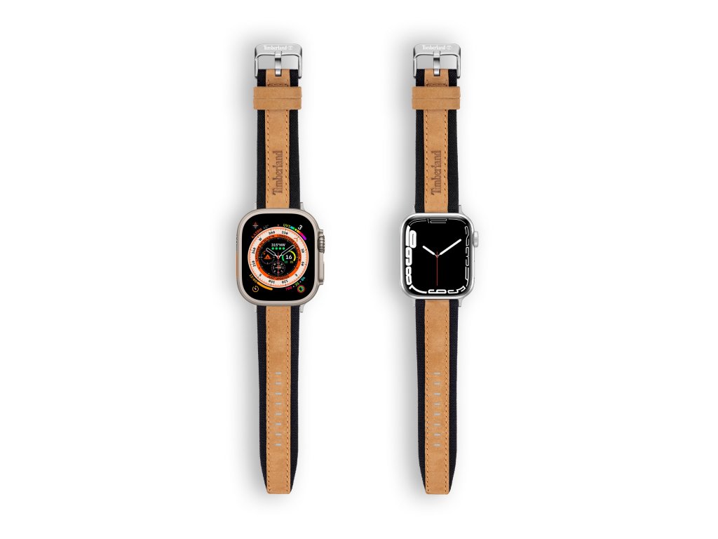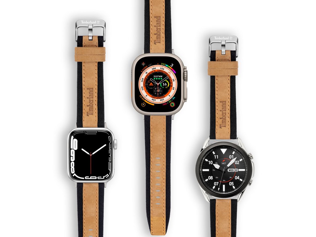 The universal unisex Timberland Arnett strap combines light brown leather and black ReBOLT material made from recycled PET bottles and is compatible with smart and classic analogue watches.