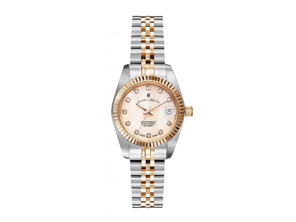 Bicolorové dámské hodinky s ocelí, růžovým zlatem, světlým číselníkem a vroubkovanou lunetou. Jako dárek navíc získáte originální krabičku Jacques du Manoir s růžemi.