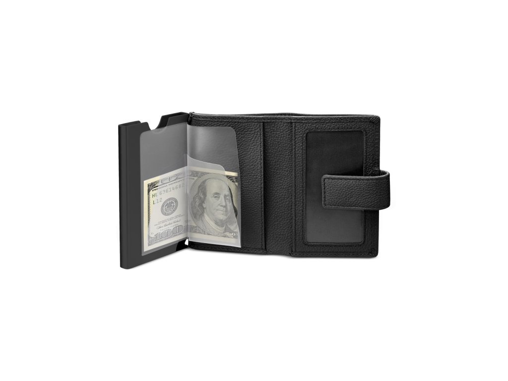 Chytrý výsuvný systém na 6 karet vám umožní mít všechno důležité po ruce. Uvnitř nechybí přihrádka na bankovky, místo na doklady ani průhledná kapsa třeba na občanku nebo řidičák.