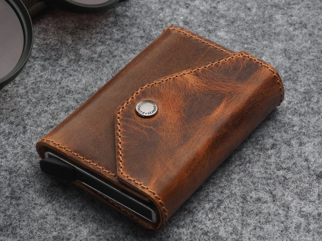 Vyrobena je ze speciálně rostlinně činěné kůže „The Original Legendary Vintage Saddle Leather", která byla ošetřena voskem a poté zahřáta v lisech, aby se vytvořil efekt stáří a patiny. Díky tomuto speciálnímu procesu se stárnutím peněženky vytváří její jedinečný charakter se změnou barvy, skvrnami a škrábanci, které jí dodávají osobní vintage kouzlo. Prošitá je nití se speciální odolností proti oděru a stárnutí.