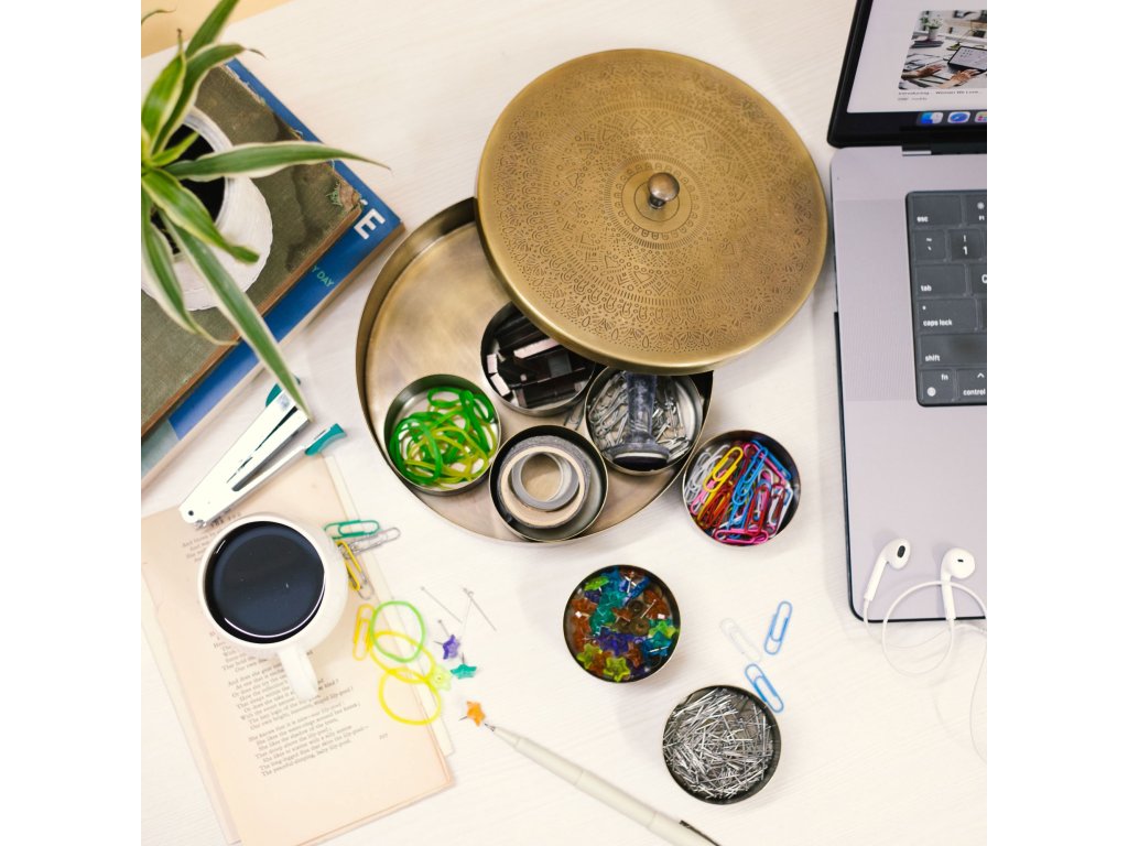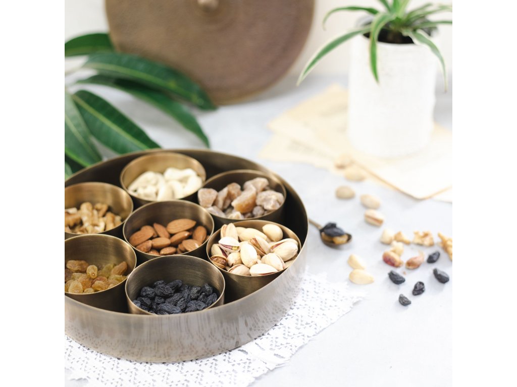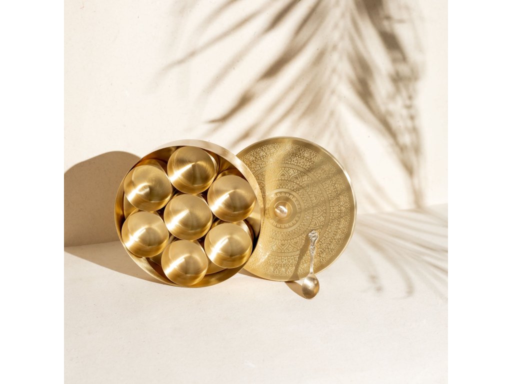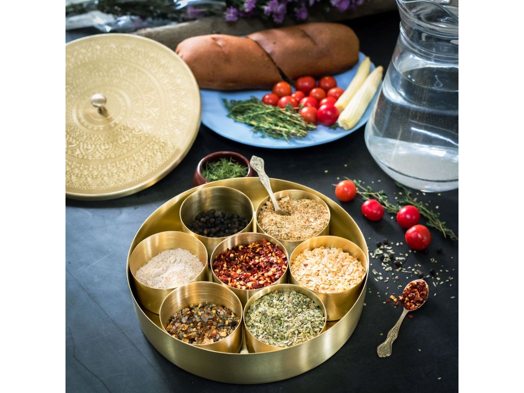 Typickou indickou kuchyni si nelze představit bez tradičních boxů na koření. Tento víceúčelový box je jimi inspirován, ale využít jej můžete i mimo kuchyň. Uložte si do něj bylinky, sladkosti na konferenčním stolku, ale třeba i šperky na komodě. Set má klasický lesklý vzhled a skládá se ze 7 malých dóz, které jsou uložené v míse o průměru 18 cm, a lžičky. Tyto víceúčelové úložné misky mají klasický, avšak moderní design, který spojuje funkčnost a estetiku a hodí se do moderního i boho interiéru.