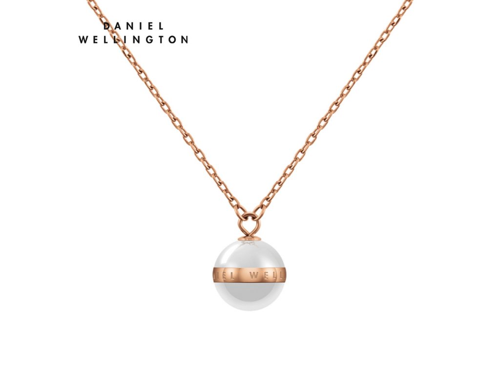 Náhrdelník ve zlatorůžové barvě s přívěskem ve tvaru kuličky bílé barvy, doplněné zlatorůžovým pruhem s logem Daniel WellingtonDoplňkové parametry