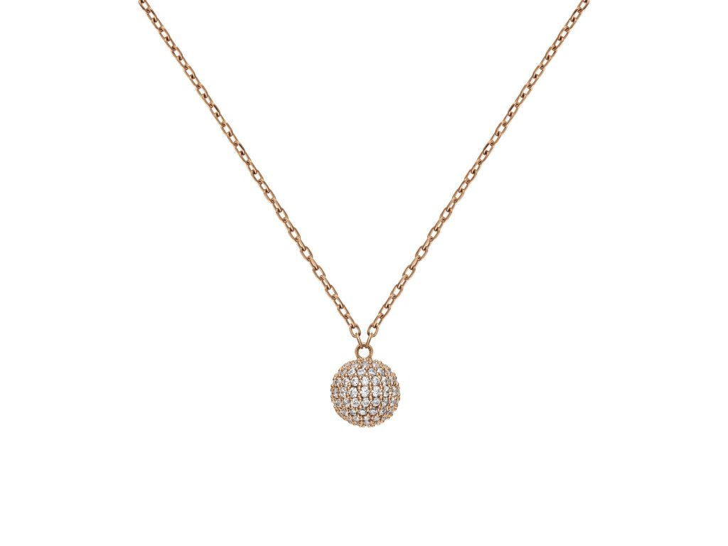 Decentní náhrdelník Pavé Crystal si vás získá svou jemnou elegancí a hravostí. Drobný řetízek, na němž je zavěšen přívěsek tvaru sféry osazený krystaly kubické zirkonie vám bude věrným doplňkem jak k pracovnímu kostýmu, tak i k volnočasovým outfitům. Přívěsek se na světle překrásně třpytí a jeho odlesky zaujmou nejedno oko.