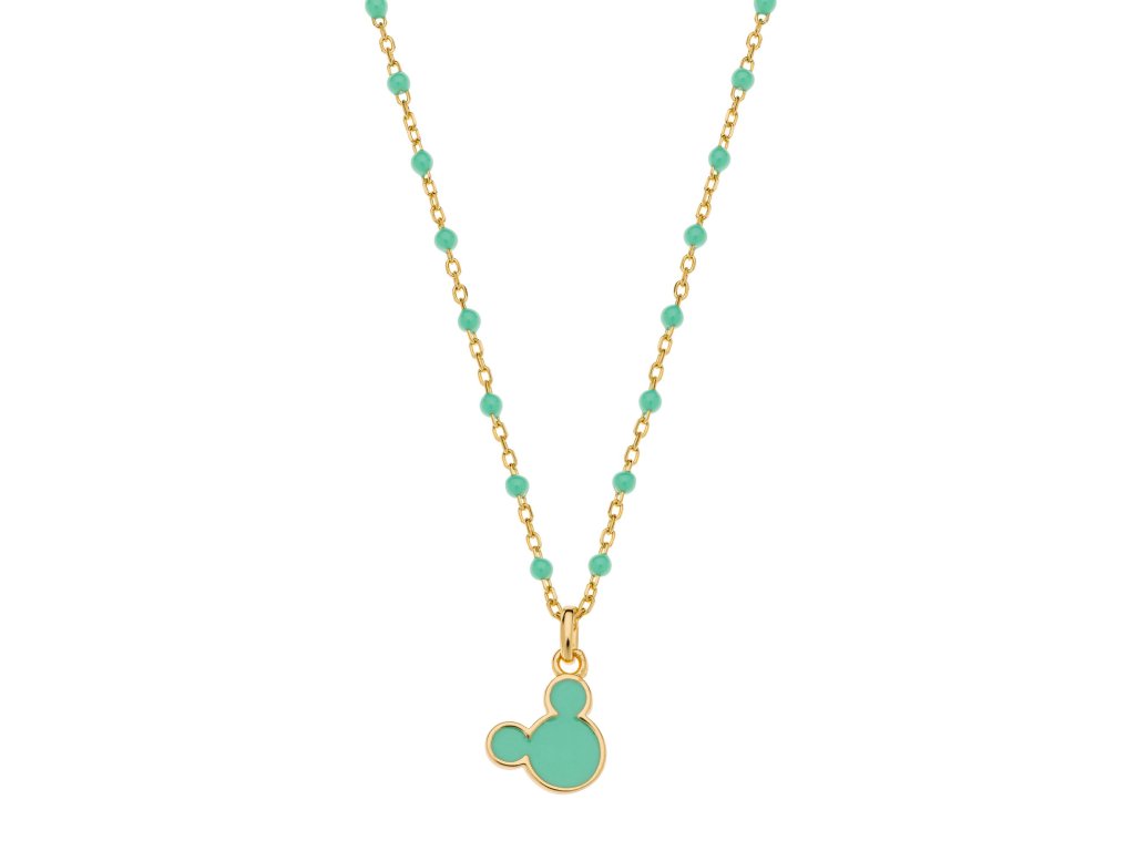 Pozlacený stříbrný dětský náhrdelník se zelenými korálky a přívěskem ve tvaru hlavy Mickey Mouse potěší všechny malé milovníky ikonických disneyovských motivů. Zelený smalt zvýrazňuje charakteristické detaily a dokonale ladí s barevnými korálky.