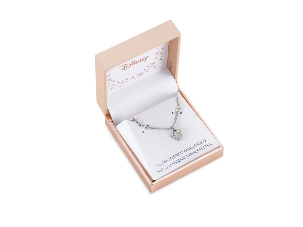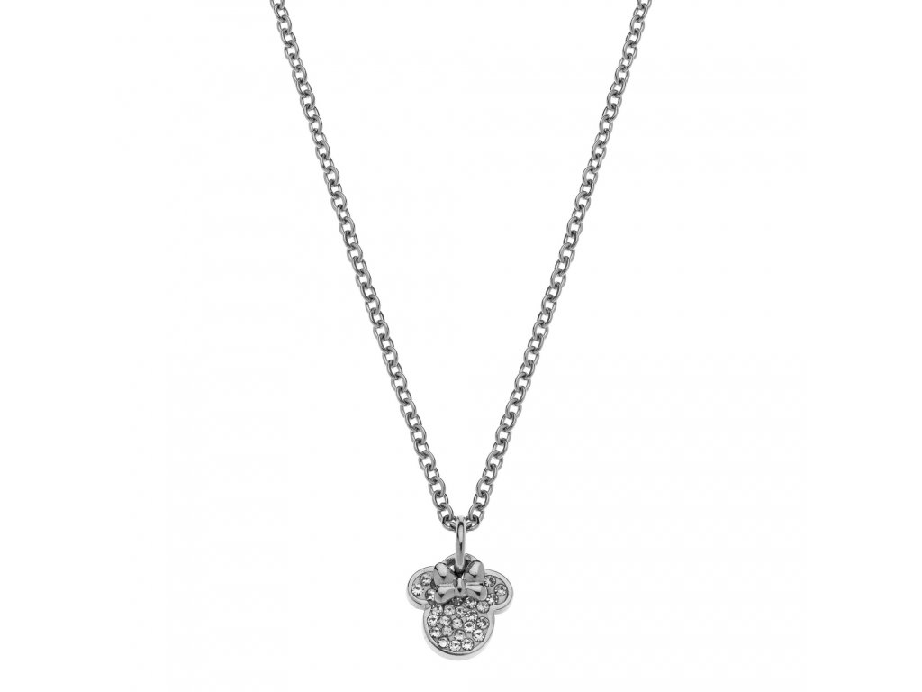 Náhrdelník s přívěskem ve tvaru hlavy postavičky myšky Minnie Mouse od Disney je vyroben z nerezové oceli s lesklou povrchovou úpravou. Přívěsek je zdoben čirými krystaly, které v kombinaci s barvou oceli vypadají krásně. Maximální délka náhrdelníku je 40,5 cm. Dodáván je ve stylové krabičce.