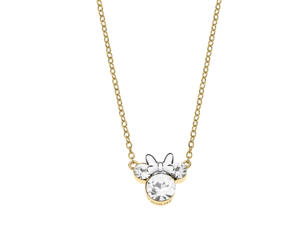 Tento elegantní dětský náhrdelník s ozdobou ve tvaru Minnie Mouse potěší všechny malé princezny, které milují klasické disneyovské motivy. Jemná mašle ve stříbrné barvě doplňuje tři čiré krystaly, které dodávají šperku jemný třpyt a nadčasový vzhled.