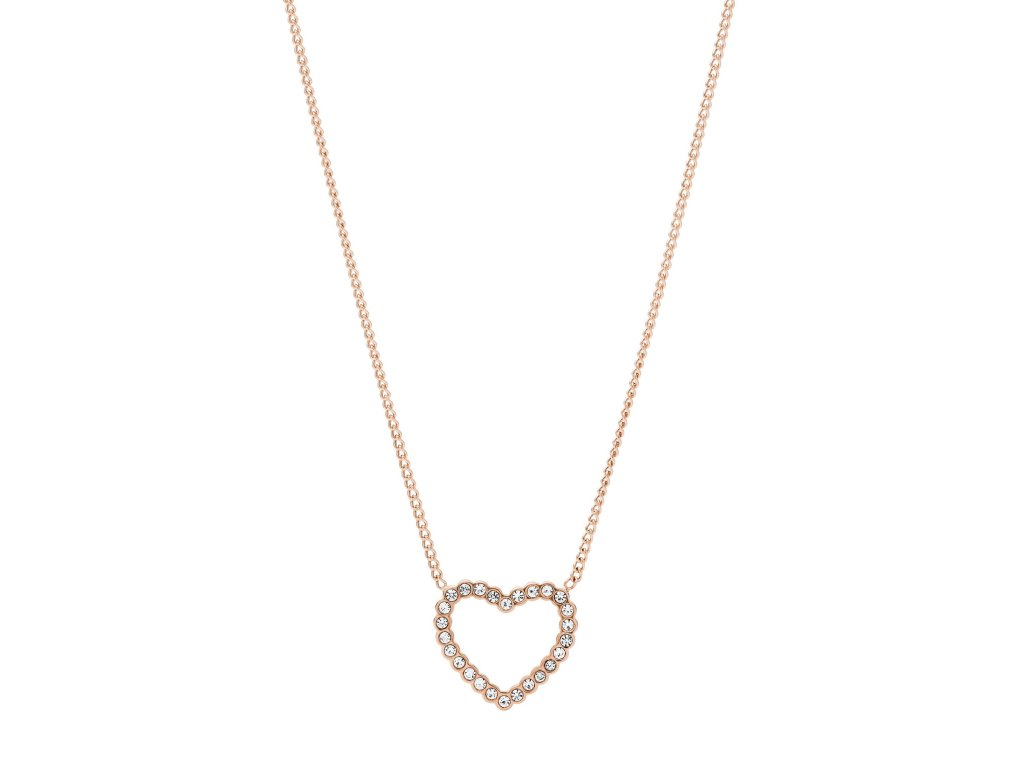 Půvabný náhrdelník pro všechny ženy s romantickou duší. Růžovozlaté tóny šperku, symbol srdce a jemný lesk kubických zirkonií tvoří dokonalou symbiózu, která dodá vašemu vzhledu jiskru a jedinečný šarm.