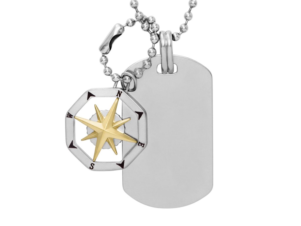 Náhrdelník je vyroben z nerezové oceli a vyniká dvěma přívěsky, které přitáhnou pozornost okolí. Jeden je v designu psí známky a druhý připomíná kompas, který má na sobě pozlacené detaily.