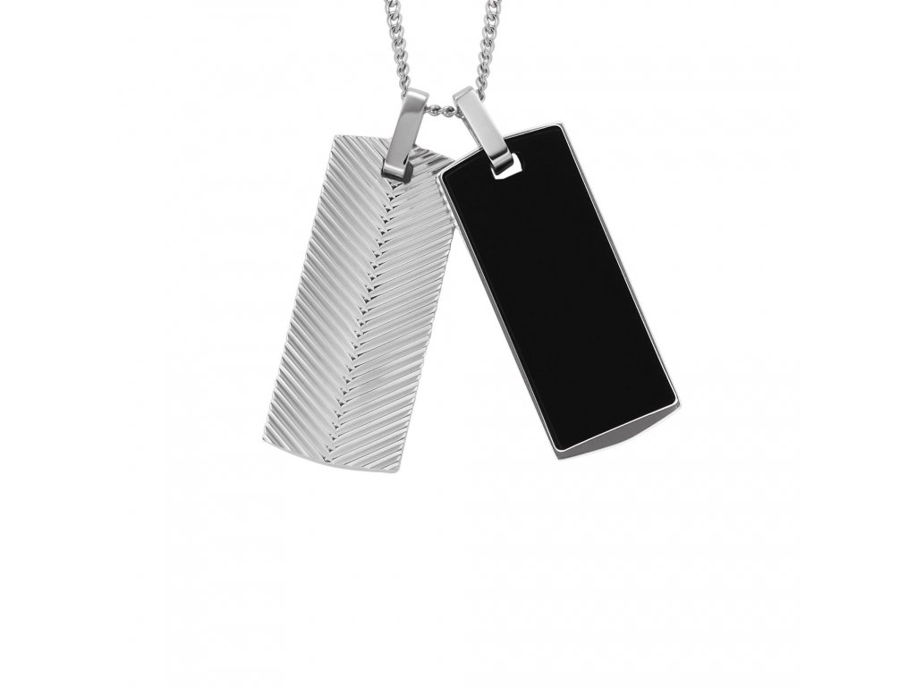 Náhrdelník je vyroben z nerezové oceli a vyniká dvěma přívěsky ve stylu military, z nichž každý má jiný design. Jeden je specifický svou texturou, druhý onyxovou barvou.
