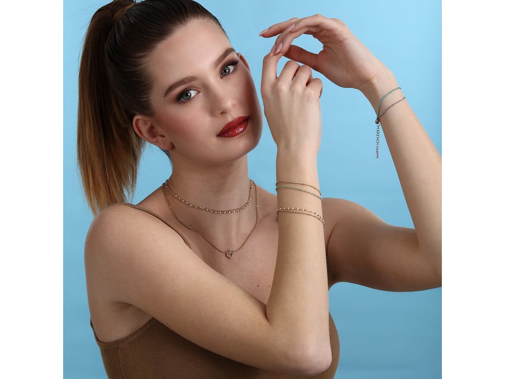 Díky použití nerezové oceli se jedná o šperk, který odolá času i každodennímu nošení. Navíc je hypoalergenní a příjemný na dotek. Zlaté provedení a krystaly mu dodávají špetku třpytu.