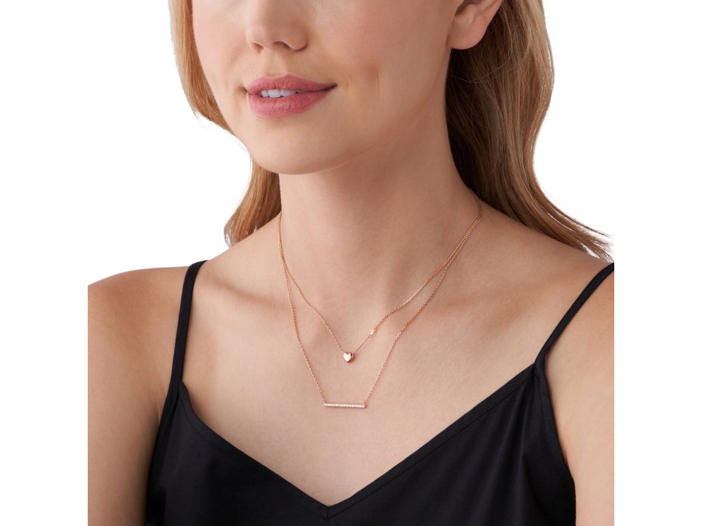 Náhrdelník je tvořen dvěma řetízky v růžovozlatém provedení. Jeden je zdoben srdíčkem a druhý geometrickým prvek s krystaly kubické zirkonie. Základ náhrdelníku tvoří kvalitní stříbro ryzosti 925 a jeho délku si můžete přizpůsobit dle libosti. Váha šperku je 3,52 g.
