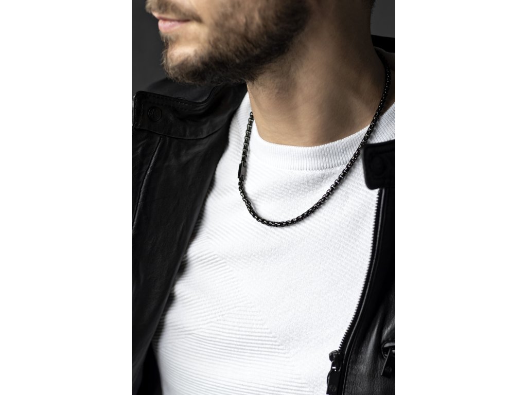 Ocelový náhrdelník v černé barvě vzhledu silnějšího řetězu zdobený obdélníkem s klasickým zapínáním.Doplňkové parametry