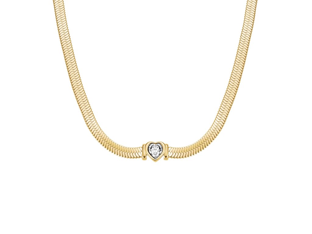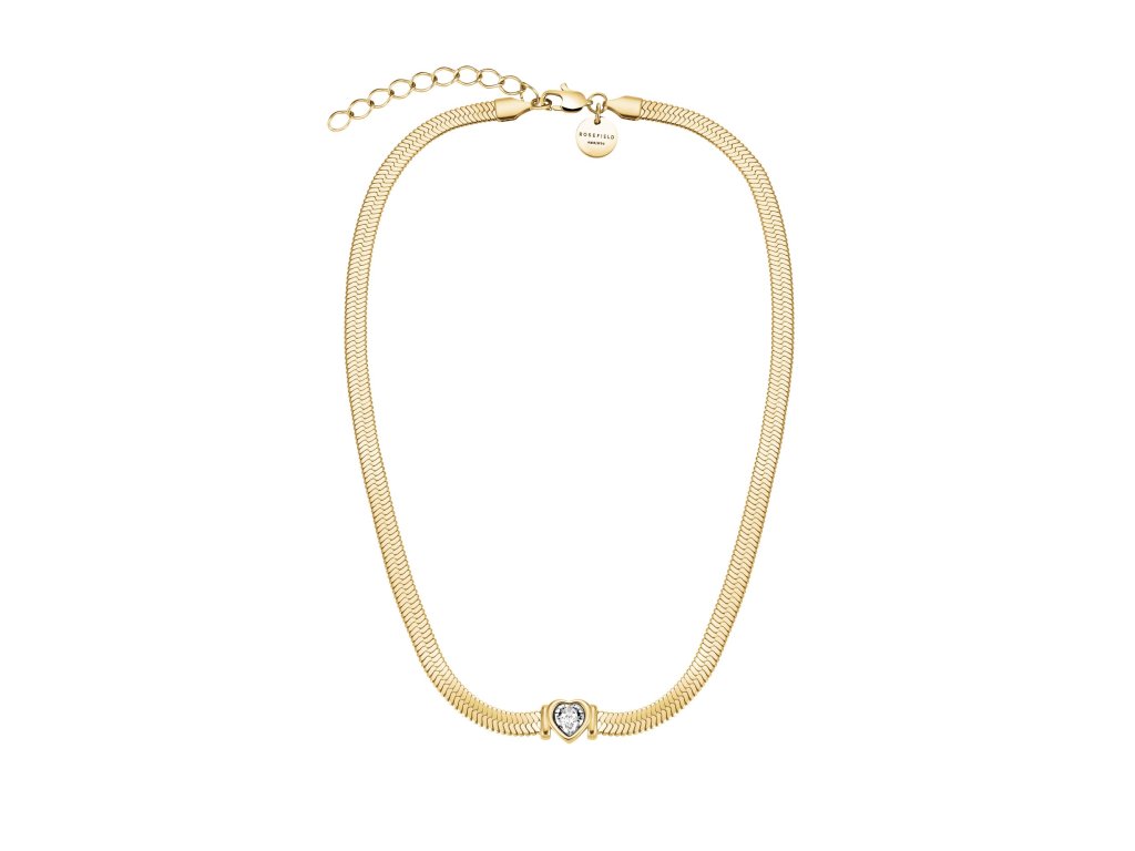 Flat snake náhrdelník Rosefield Snake Heart Choker zaujme moderním designem a jemným detailem v podobě čirého krystalu ve tvaru srdce, který je precizně zasazený do středu šperku.