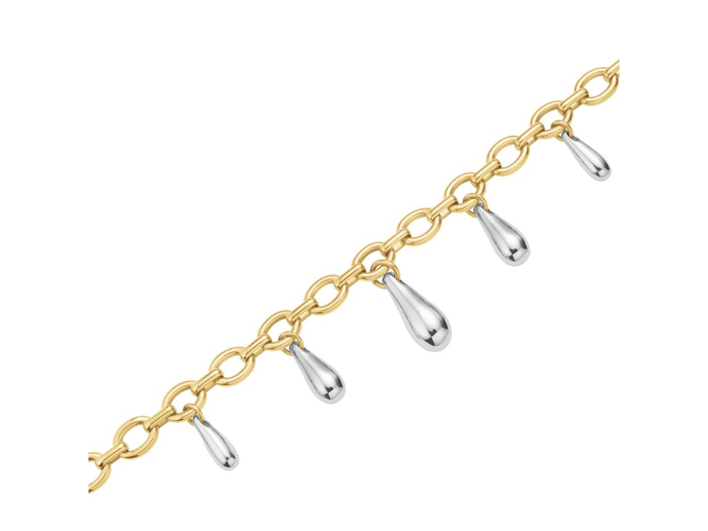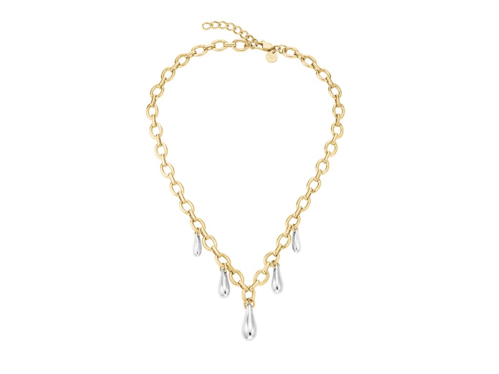 Každý detail tohoto modelu je navržen tak, aby zaujal – od kontrastu zlata a oceli až po pravidelně rozmístěné kapky s hladkým leskem. Délka 40–44 cm je ideální pro nošení přímo na krku, kde náhrdelník vynikne jako dominantní prvek celého outfitu.