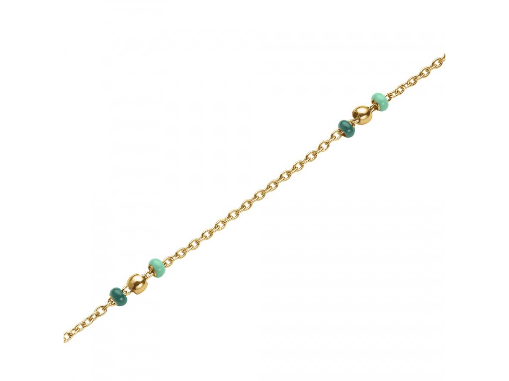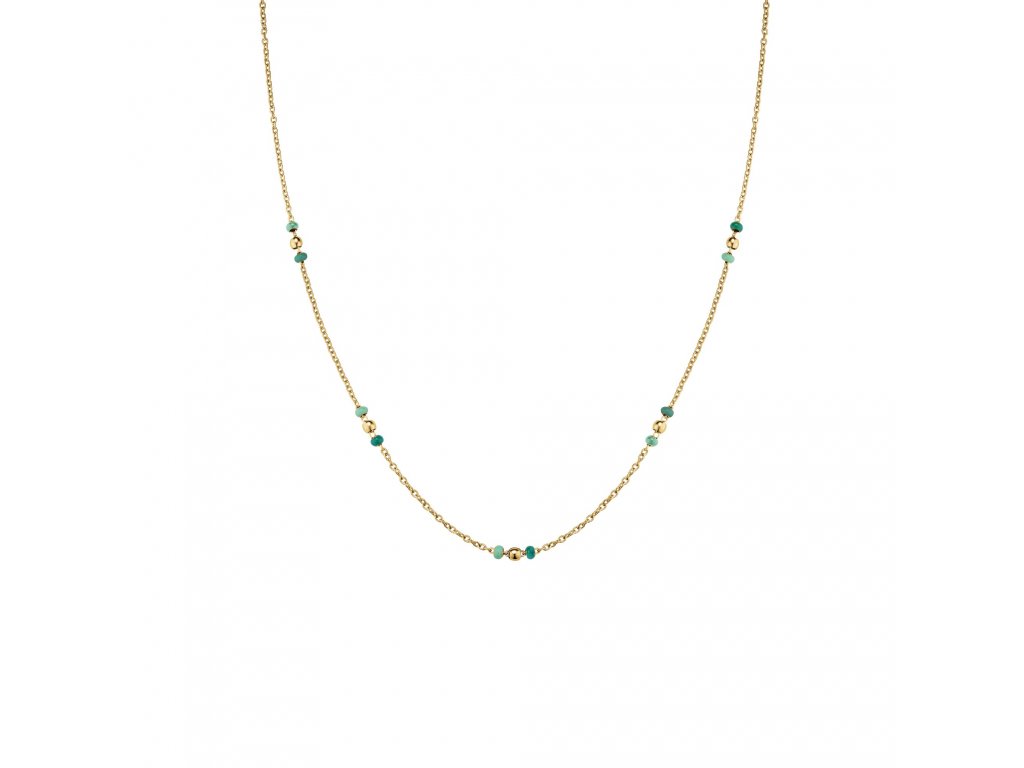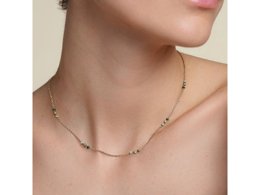 Náhrdelník má zlatou barvu a je řetízkový. Jeho obvod zdobí trojkombinace malých korálků ve zlaté a odstínech smaragdově zelené, které dohromady vytvářejí harmonický celek. Tento šperk ocení ženy, které baví jemné doplňky.