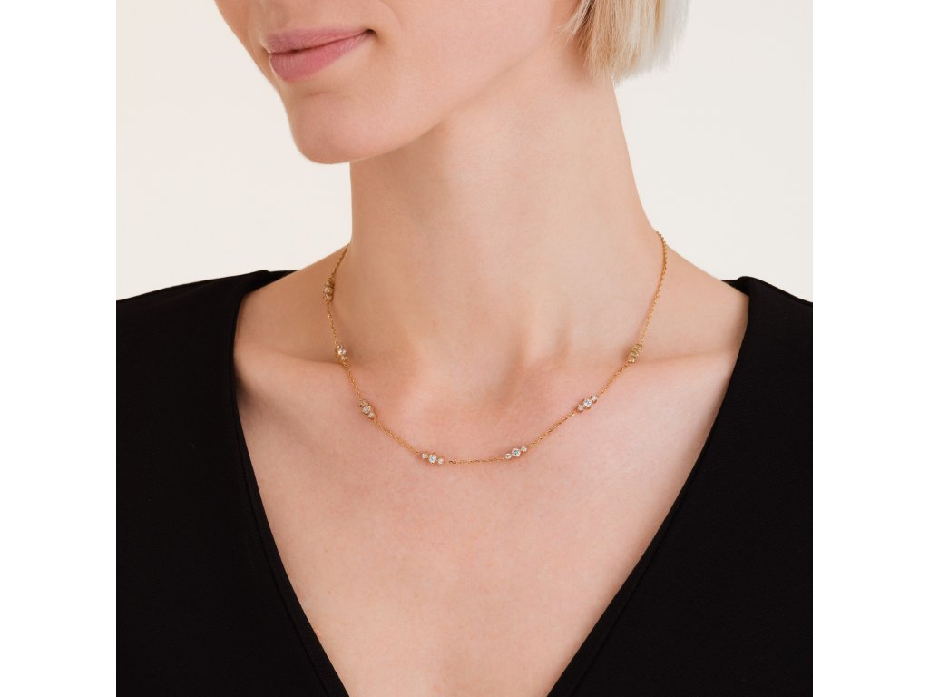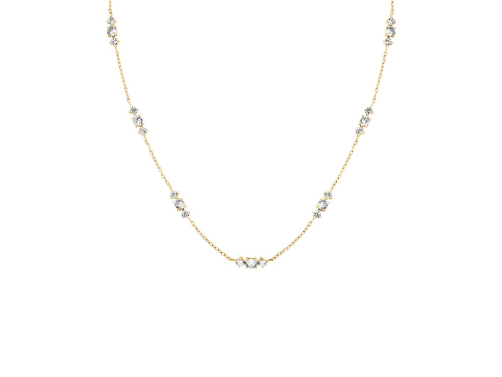 Náhrdelník Triple Crystals Necklace upoutá rafinovaným zdobením v podobě sedmi elegantních trojic čirých krystalů, které jsou jemně rozmístěné po celé délce řetízku. Tento stylový detail dodává šperku sofistikovaný lesk a nadčasovou ženskou energii.