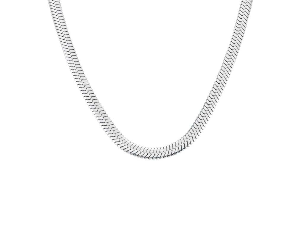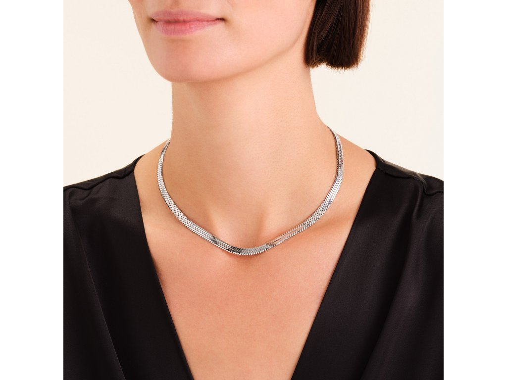 Moderní, rafinovaný a výrazný – dámský náhrdelník Rosefield Large Snake Necklace okouzlí svým hladkým profilem a texturou připomínající hadí kůži. Elegantní provedení s rhodiovanou úpravou dodává šperku decentní lesk a univerzální nositelnost.