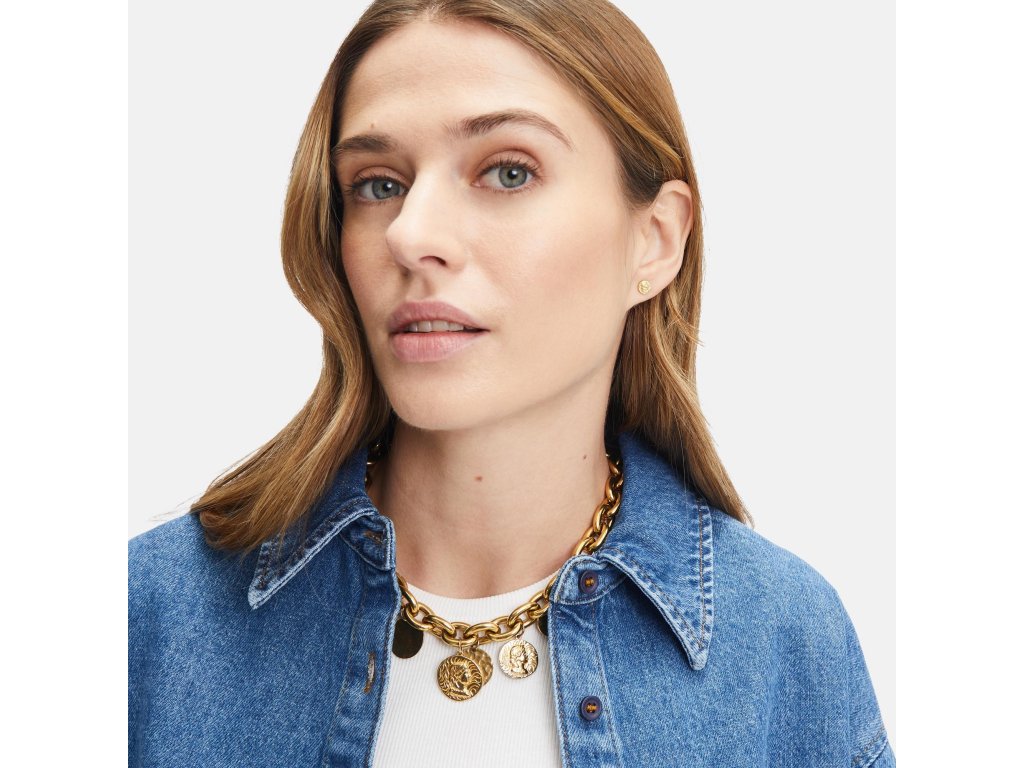 Náhrdelník je vyroben z kvalitní nerezové oceli, která vyniká odolností, barevnou stálostí a komfortem při nošení. Zlatý tón v kombinaci s lesklou povrchovou úpravou působí elegantně a nadčasově, přívěsky se při pohybu jemně odrážejí od světla a dodávají šperku živost. Pevná délka přibližně 48 cm umožňuje náhrdelník nosit samostatně jako dominantní prvek outfitu.