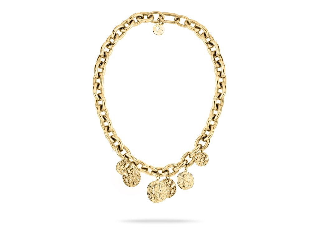 Dámský náhrdelník Tamaris ve zlaté barvě je výrazným šperkem, který přitahuje pozornost jemným pohybem a dekorativním detailem. Šest přívěsků ve tvaru mincí dodává náhrdelníku lehce bohémský nádech a zároveň vytváří moderní, stylově sebevědomý dojem.