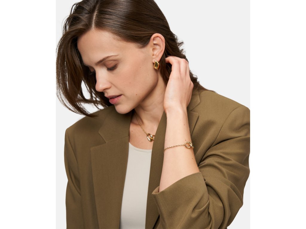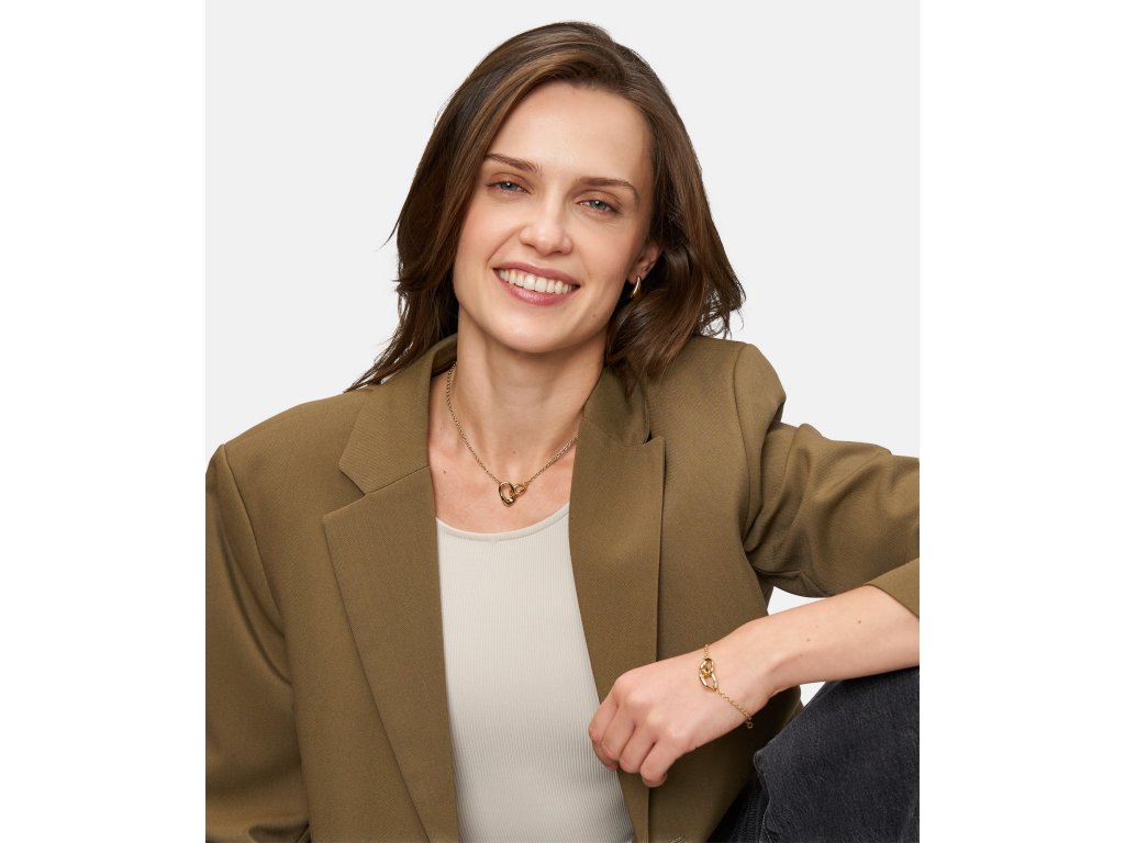 Náhrdelník je vyroben z kvalitní nerezové oceli, která vyniká dlouhou životností, barevnou stálostí a komfortem při každodenním nošení. Zlatý tón v kombinaci s lesklou povrchovou úpravou podtrhuje plynulé linie přívěsku a zvýrazňuje jeho moderní charakter. Nastavitelná délka v rozmezí cca 40–45 cm umožňuje přirozené přizpůsobení dekoltu i variabilní styling.
