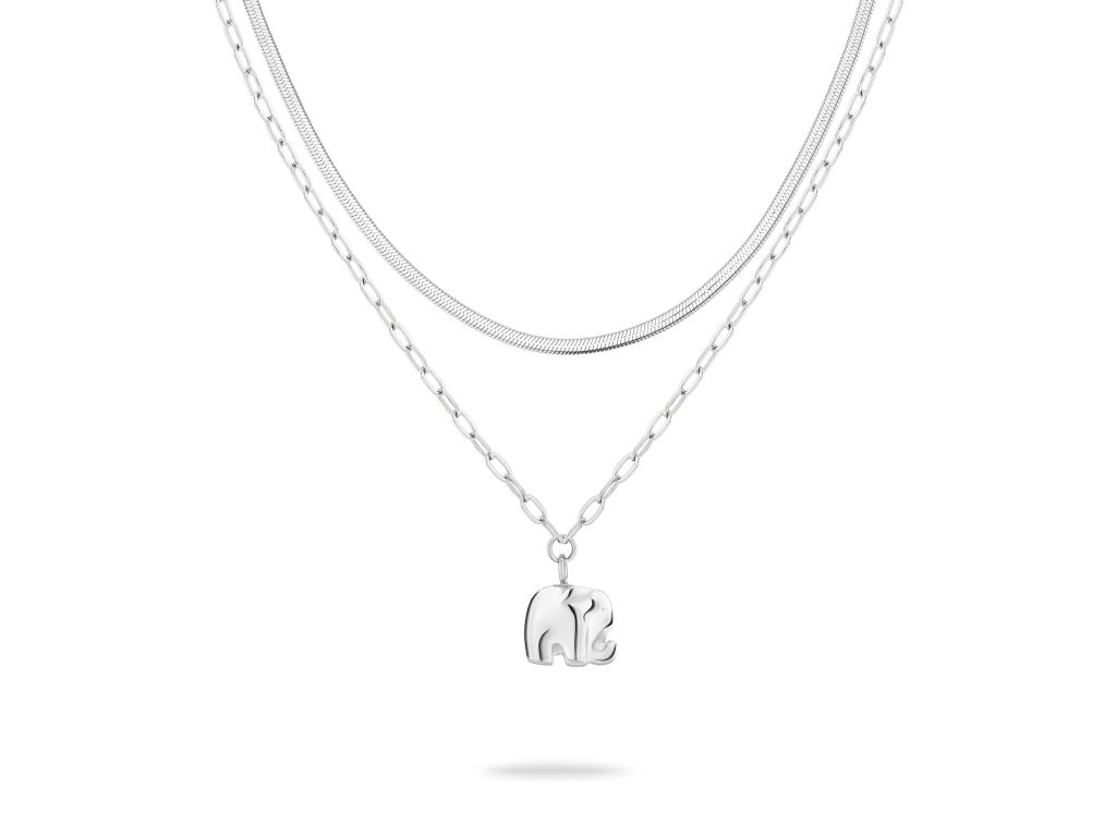 Set tvoří dva nádherně sladěné náhrdelníky z kvalitní nerezové oceli ve stříbrném provedení. Hadovitý řetízek o délce 42 cm přidává na sofistikovanosti a rafinovaném vzhledu, zatímco jemný řetízek o délce 47 cm s něžným přívěskem slona dodává celku osobitý nádech. Díky vrstvenému efektu působí šperk moderně a stylově.