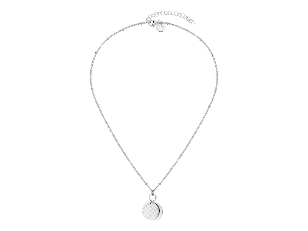 Půvabný dámský náhrdelník od německé značky Tamaris obsahuje dva kruhové přívěsky, z nichž jeden je zdobený logy značky.