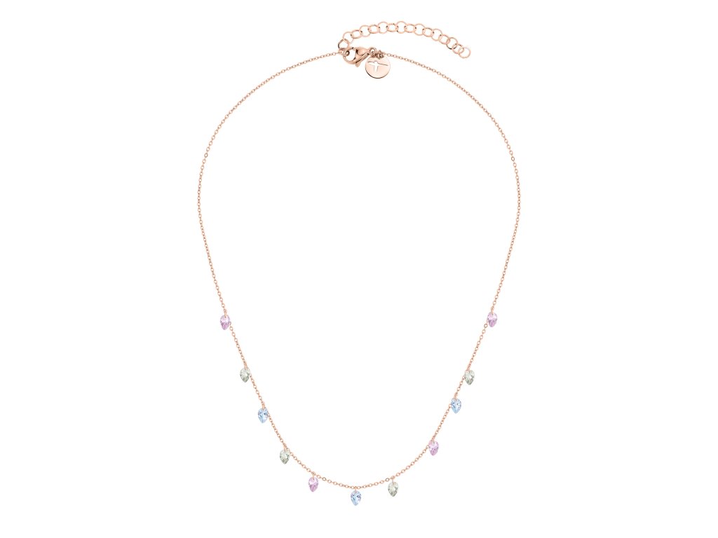 Růžově-zlatý náhrdelník Tamaris upoutá pozornost každého. Přívěsky ve tvaru kapky s jemnými barevnými zirkony tvoří z náhrdelníku elegantní a třpytivý kousek. Kvalitní provedení i použité materiály zajistí, že se z náhrdelníku stane váš oblíbený nadčasový kousek. Díky zapínání na karabinku si můžete délku řetízku přizpůsobit podle svých potřeb. Celková délka náhrdelníku je 45 cm.Doplňkové parametry