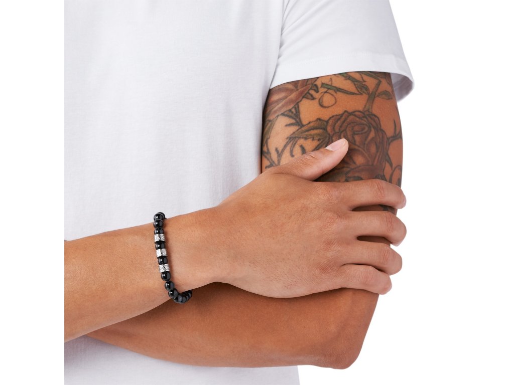 V náramku se potkávají dva typy korálků, ocelové s detaily a černé, které mu dodávají nádech elegance. Délka náramku jde přizpůsobit velikosti zápěstí.