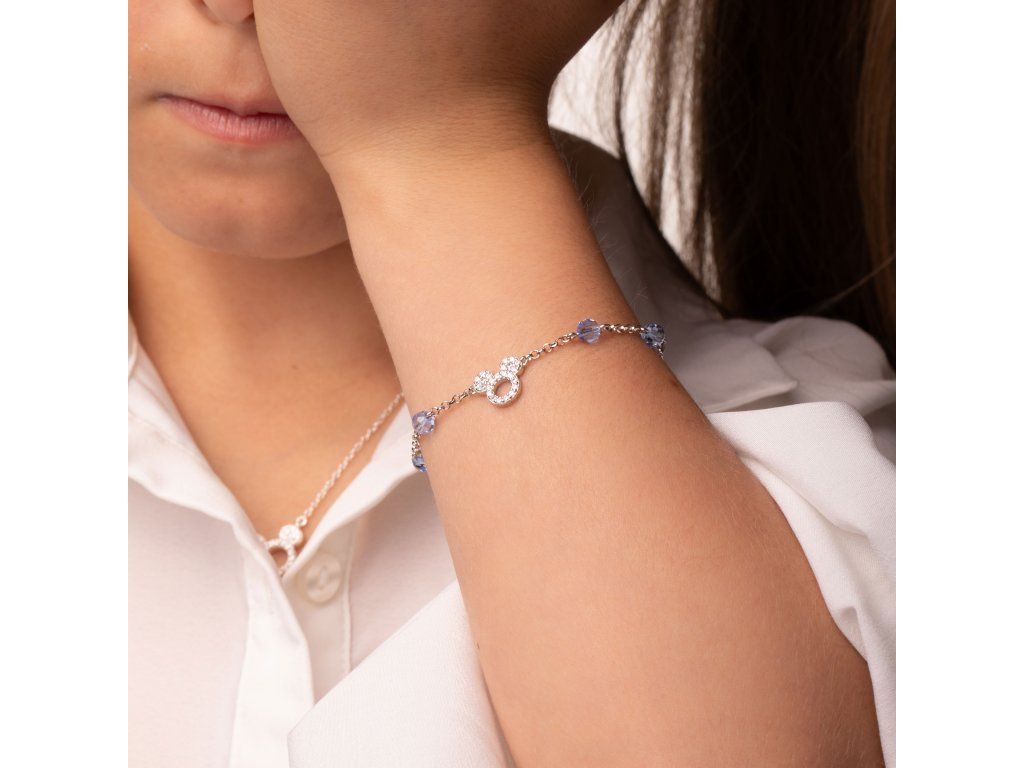 Stříbrný dětský náramek s modrými broušenými korálky a ozdobou ve tvaru hlavy Mickey Mouse potěší všechny malé milovníky ikonických disneyovských motivů. Modré korálky dodávají šperku jemný barevný akcent, zatímco čiré krystaly zvýrazňují tvar oblíbené postavičky.