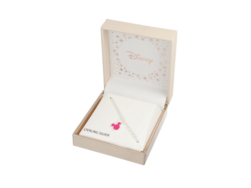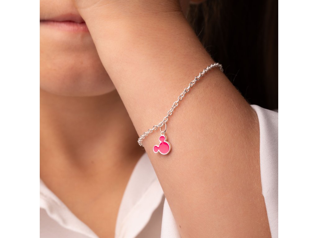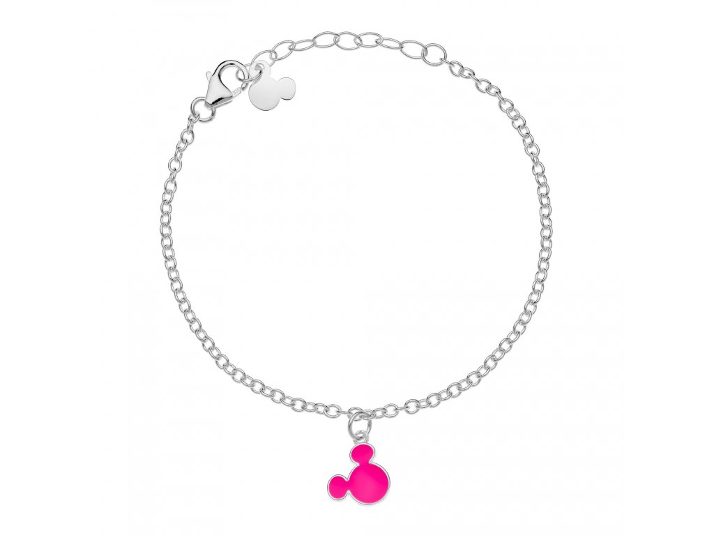 Náramek zdobený hlavou postavičky myšáka Mickey Mouse od Disney je vyroben z velmi kvalitního stříbra ryzosti 925 s lesklou povrchovou úpravou. Hlava myšáka Mickey je zdobena růžovým smaltem, který na náramku zcela vyniká. Maximální délka náramku je 17 cm. Dodáván je ve stylové krabičce. Váha šperku je 1,8 g.