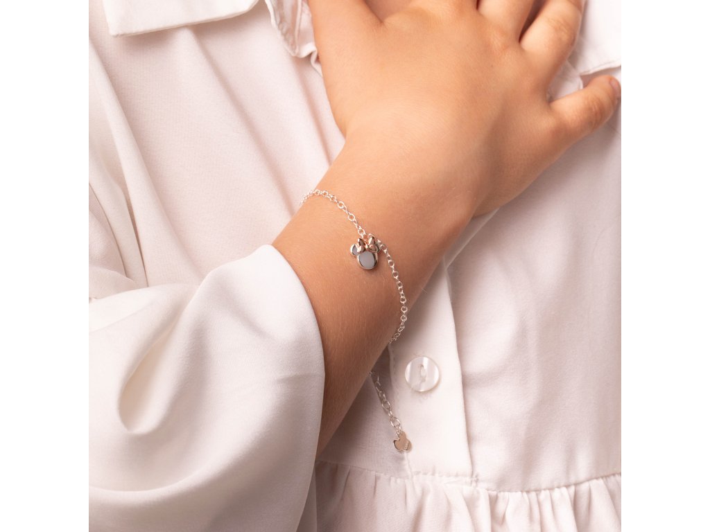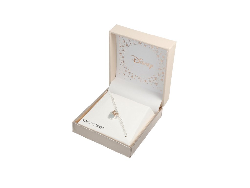 Náramek s přívěskem ve tvaru hlavy myšky Minnie Mouse od Disney je vyroben z velmi kvalitního stříbra ryzosti 925 s lesklou povrchovou úpravou. Mašle myšky Minnie Mouse je pozlacena do barvy růžového zlata a velmi pěkně tak vyniká z barvy stříbrné. Maximální délka náramku je 17 cm. Dodáván je ve stylové krabičce. Váha šperku je 3,2 g.