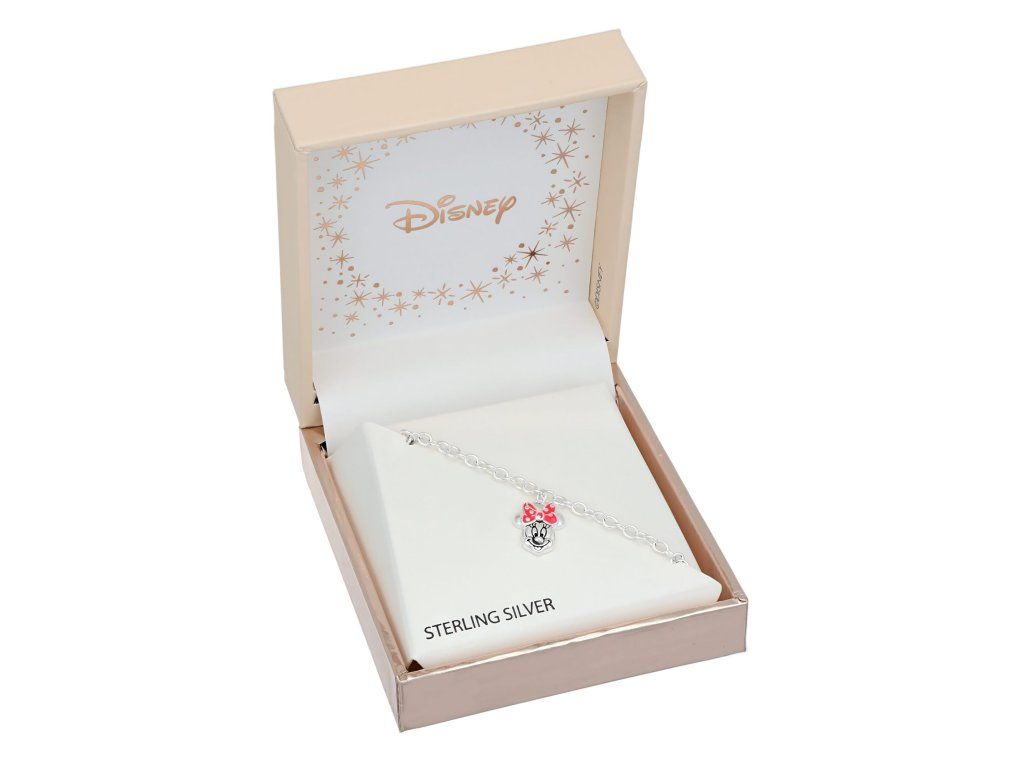 Stříbrný dětský náramek s přívěskem ve tvaru hlavy Minnie Mouse potěší všechny malé fanoušky ikonické disneyovské postavičky. Mašle je dozdobena červeným smaltem a syntetické perly dodávají šperku jemný a slavnostní vzhled.