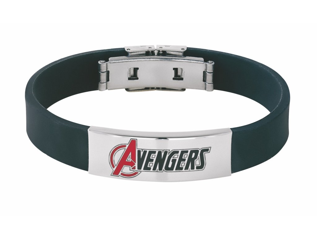 Náramek je tvořen černým silikonovým páskem, na kterém září nápis Avengers vyrobený z nerezové oceli a dekorovaný červeným a černým smaltem.