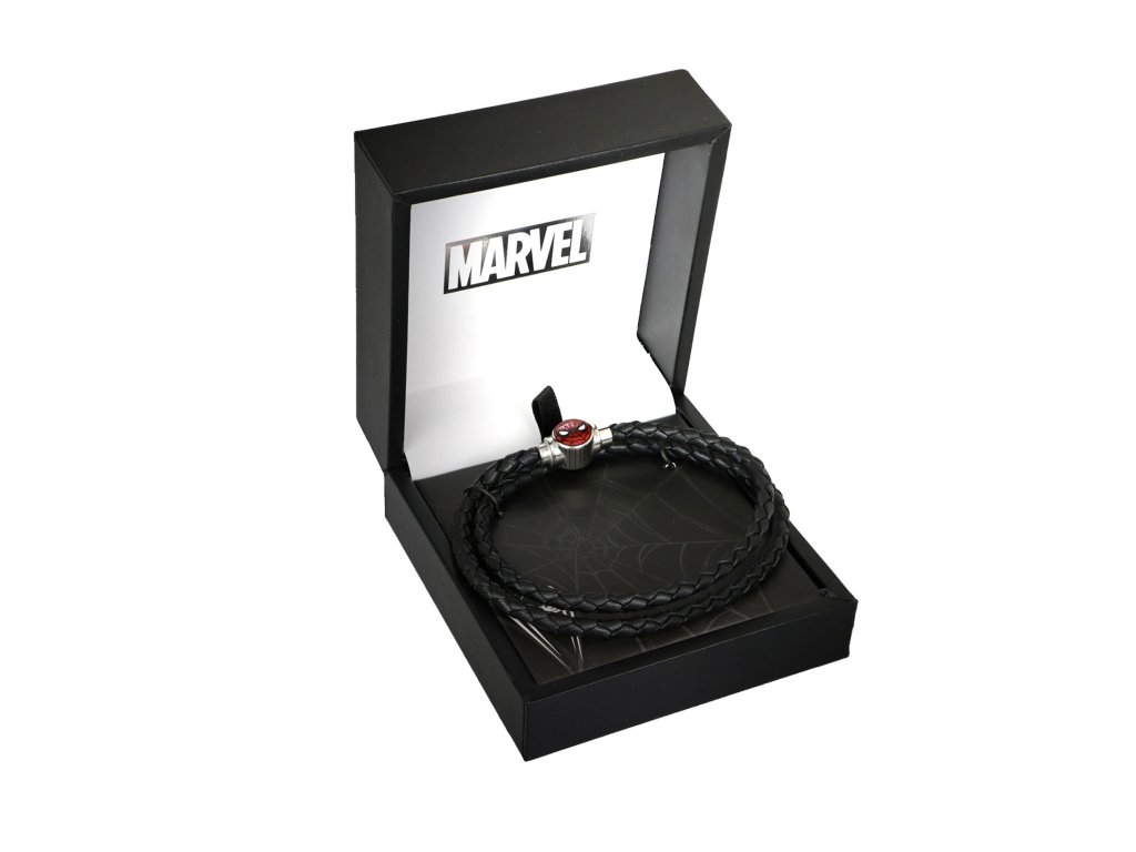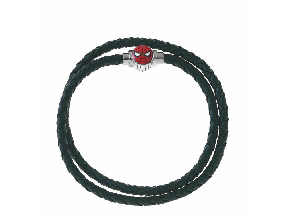 Černá spletená kůže obtočí zápěstí dvojitě, což samo o sobě vytváří elegantní efekt. Přívěsek s hlavou Spider Mana vyrobený z nerezové oceli a zdobený červeným smaltem z náramku dělá superhrdinský doplněk!