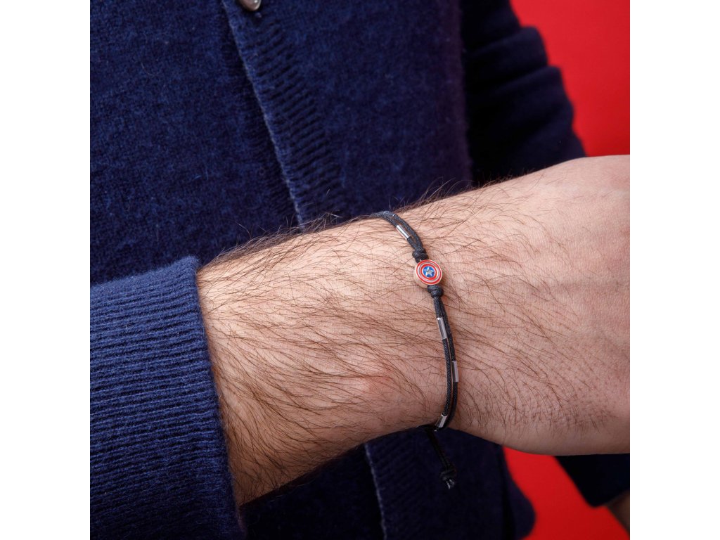 Náramek tvoří kvalitní pevná černá šňůrka ozdobená aplikacemi z kvalitního stříbra. Dominantou je stříbrný přívěsek se znakem Captain Amerika dekorovaný červeným a modrým smaltem.