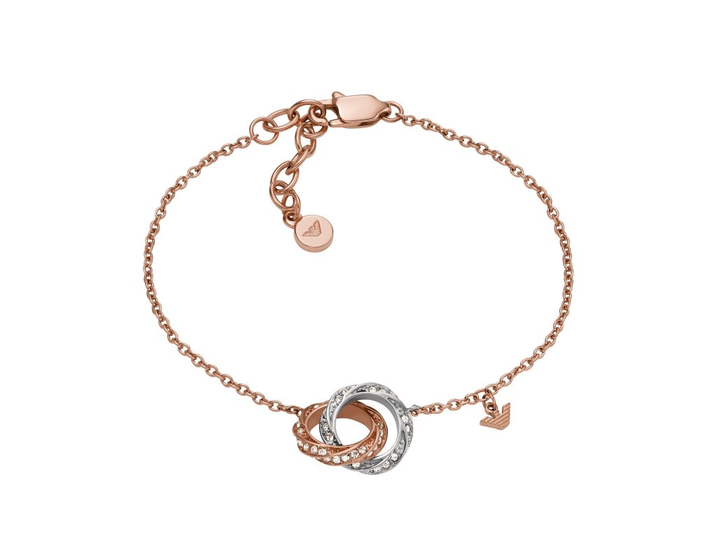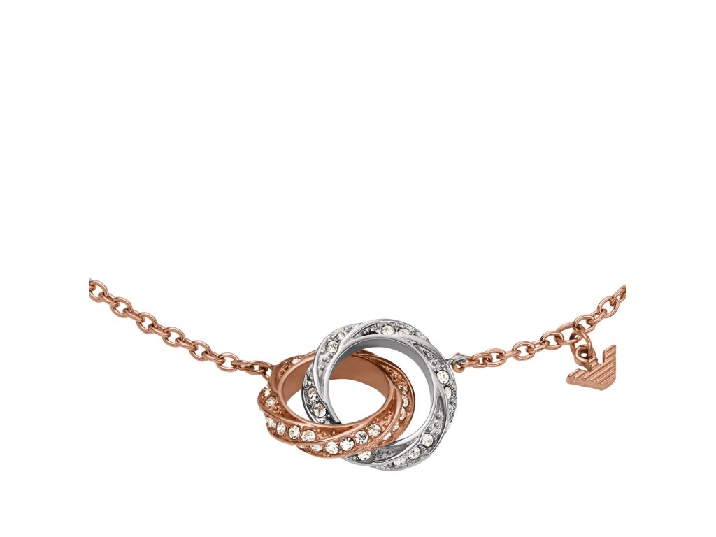 Dámský náramek od Emporio Armani v růžovozlaté barvě je dokonalou kombinací jemnosti a stylu. Dva propletené kroužky – jeden růžovozlatý, druhý stříbrný – jsou osázeny čirými krystaly, které dodávají šperku decentní třpyt. Drobné detaily s logem značky dotvářejí luxusní dojem a vizuální kontrast mezi barvami působí velmi příjemně a vyváženě.