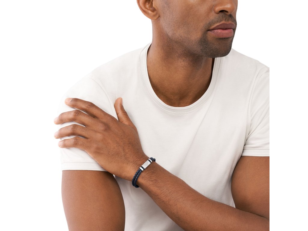 Vyroben je z kvalitní kůže v kombinaci s nerezovou ocelí, má nastavitelnou délku 19,5–21 cm a praktické zapínání na sponu. Lehký lesk kovových prvků a efektní struktura kůže podtrhují nadčasový styl.