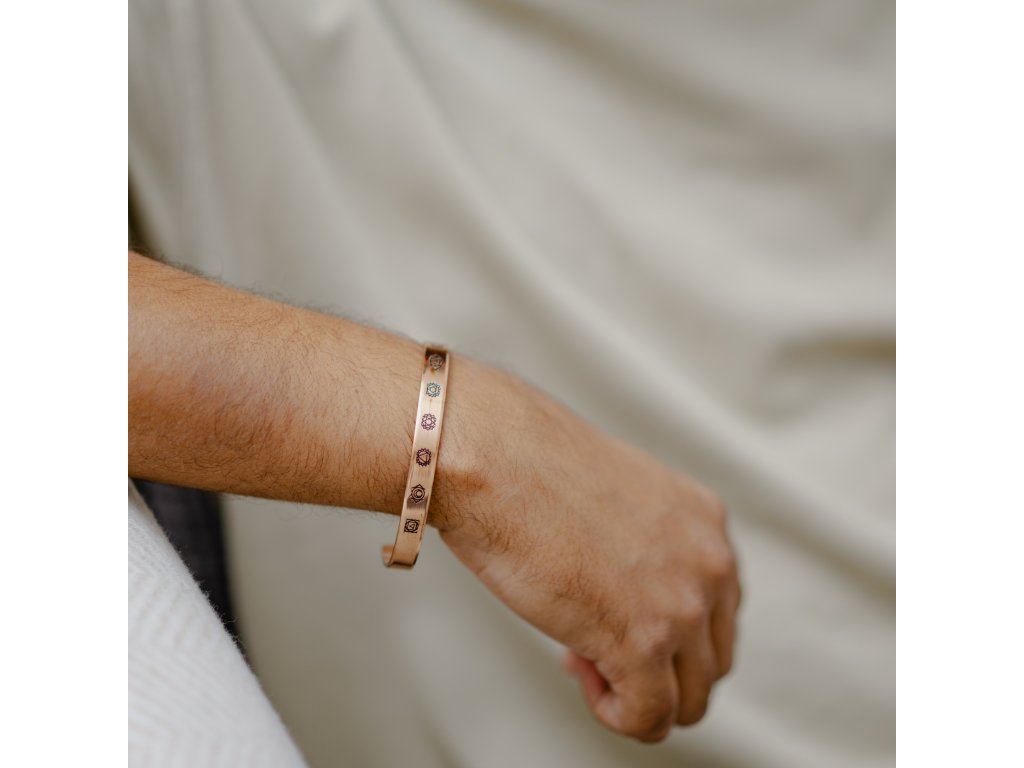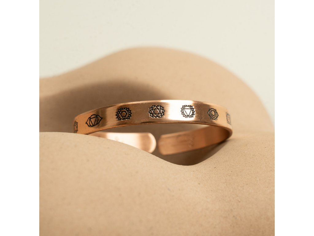 Měděný náramek Forrest & Love Chakra propojuje tradiční řemeslo s hlubším významem. Na jeho povrchu najdete symboly sedmi čaker – energetických center těla –, která reprezentují rovnováhu mezi tělem, myslí a duchem.