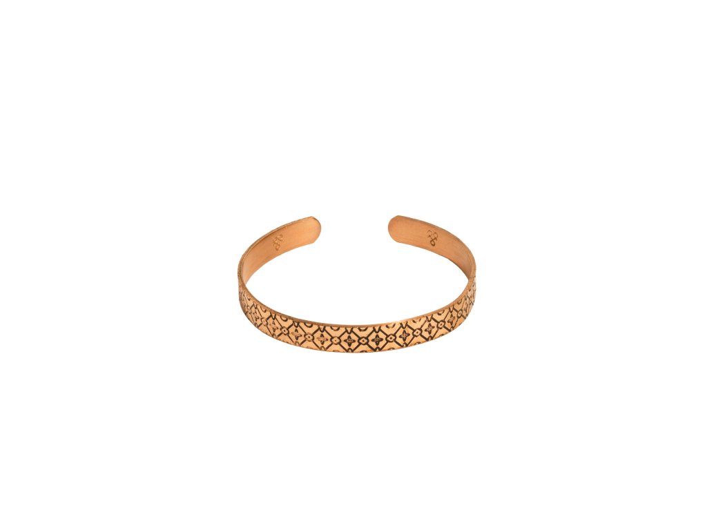 Tento pevný náramek je vyroben z více než 99 % čisté mědi, která je ceněná pro své antibakteriální a energeticky vyrovnávající vlastnosti. Podle ajurvédských principů měď pomáhá snižovat tělesné teplo, podporuje uzemnění a harmonizuje tok energie v těle.