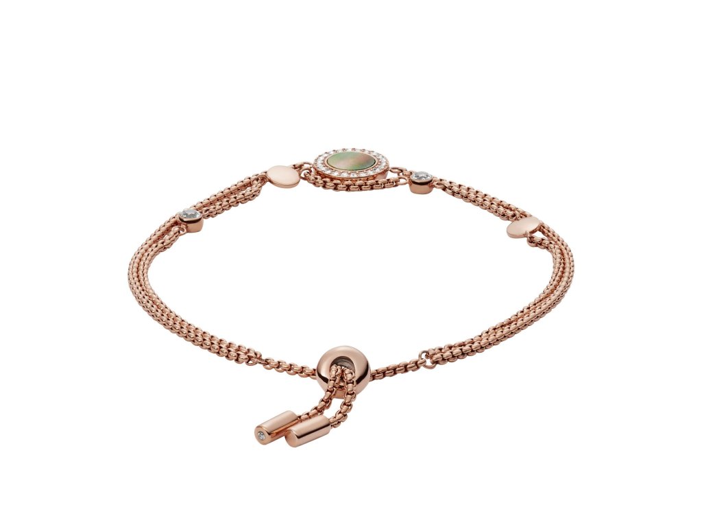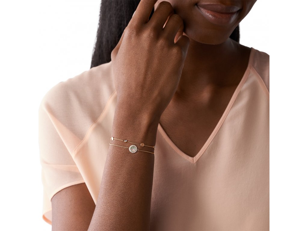 Náramek je tvořen dvěma řetízky, které se potkávají v kulatém detailu s perleťovým akcentem a drobnými krystaly. Celé provedení šperku, který je z nerezové oceli v růžovozlaté barvě, působí velmi žensky a elegantně.