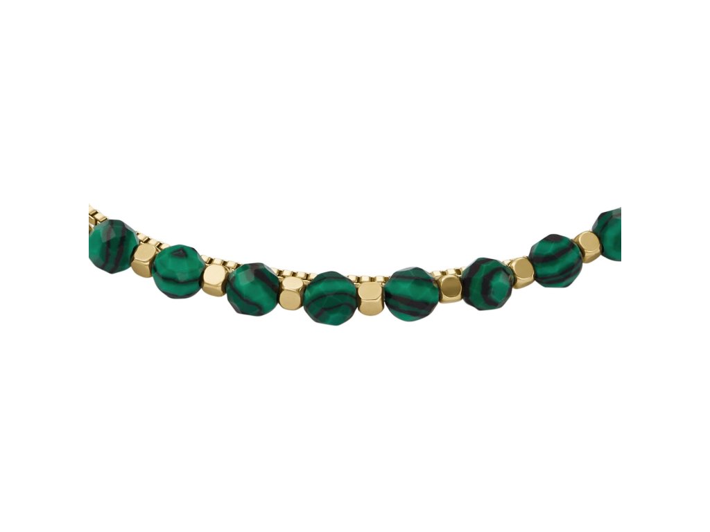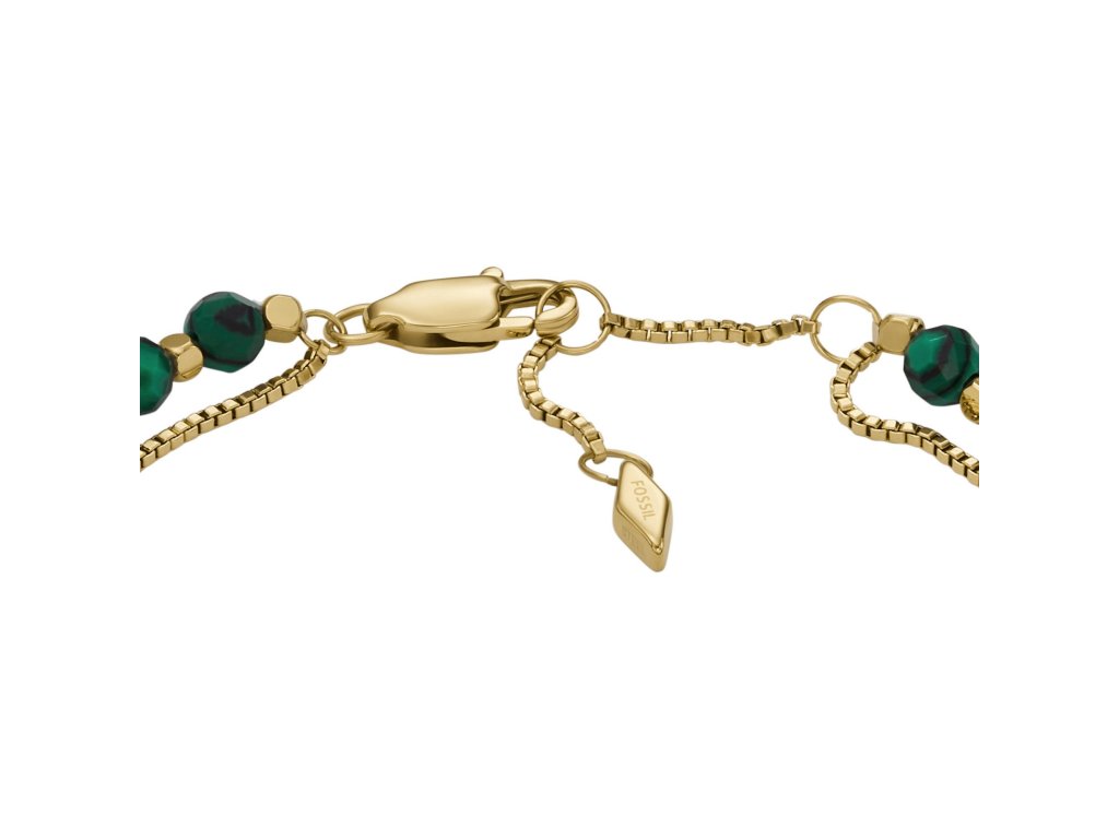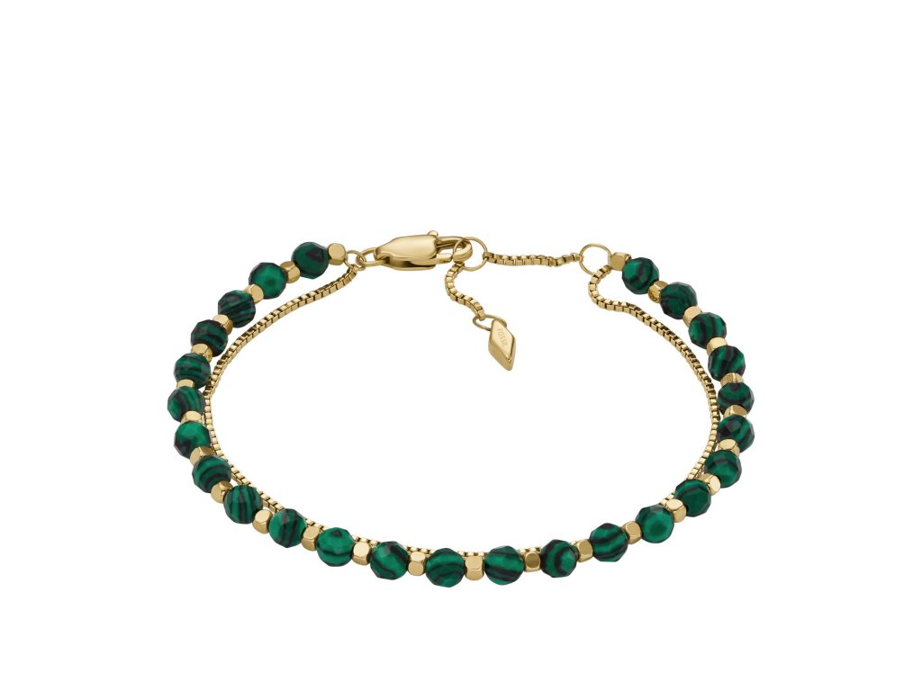Stylový a skvěle kombinovatelný, to je dámský dvojitý náramek od Fossil, jehož základ tvoří korálky zeleného malachitu. Malachit má atraktivní smaragdový nádech, harmonizuje duši a je to silný ochranný kámen. V harmonickém kontrastu pak s ním ve šperku funguje nerezová ocel ve zlatém tónu, která tvoří základ náramku. Délku náramku si můžete přizpůsobit díky speciálnímu zapínání. Nenechte si ujít také další šperky od americké značky Fossil, která je synonymem kvality a moderního stylu v oblasti módních doplňků. E-shop LeMode.net je oficiálním distributorem značky.
