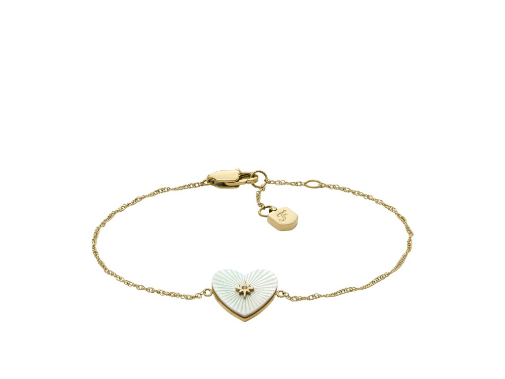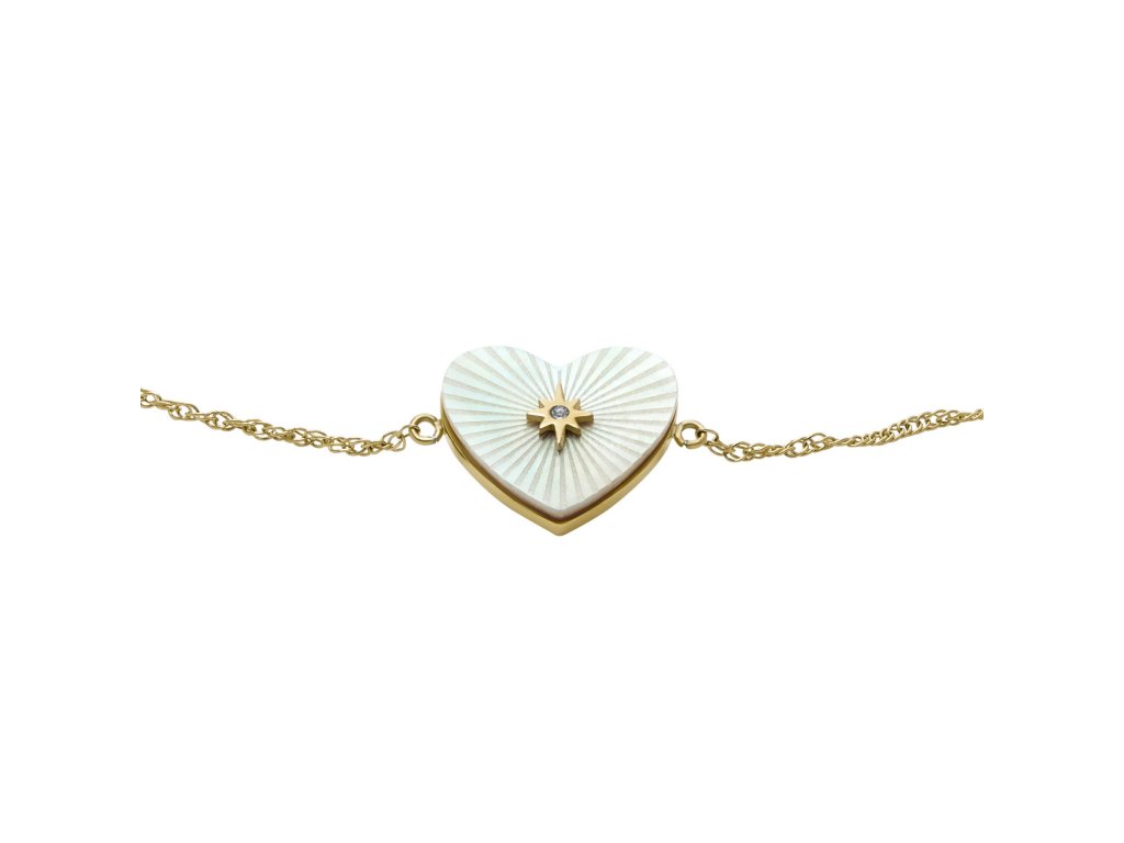 Svým jemným designem plným detailů zaujme náramek od Fossil, ve kterém se kombinuje srdíčkový tvar s perletí, pozlaceným detailem ve tvaru hvězdy a krystalem kubické zirkonie. Ideální volba pro speciální příležitosti i každodenní nošení, kdy chcete přidat nádech elegance.