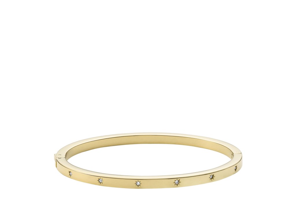 Dámský pevný náramek Fossil Sadie Shine Bright přináší elegantní design, který v sobě spojuje jemný třpyt a moderní praktičnost. Zlatá barva nerezové oceli doplněná krystaly vytváří atraktivní vzhled, který okamžitě zaujme.
