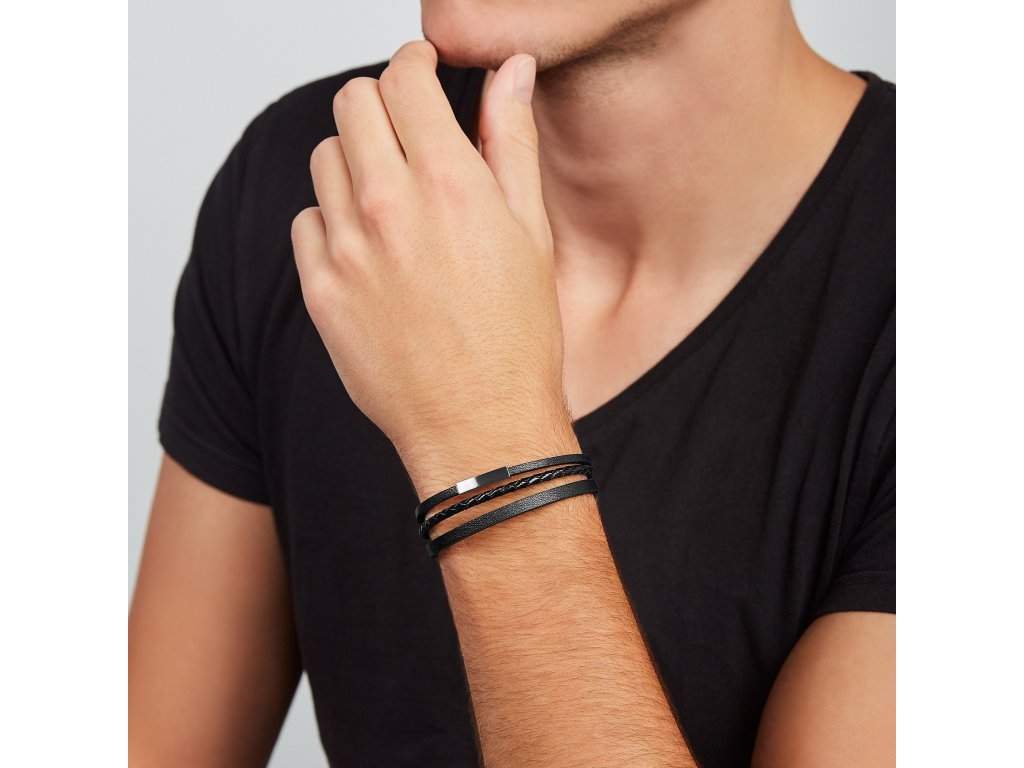 Tvoří jej 3 různé kožené řemínky, které se potkávají v ocelovém zapínání. Ocel dodává šperku sílu a mužnost, černá kůže zase eleganci. Náramek působí decentním dojmem a hodí se jak k formálnějšímu outfitu, tak na párty.