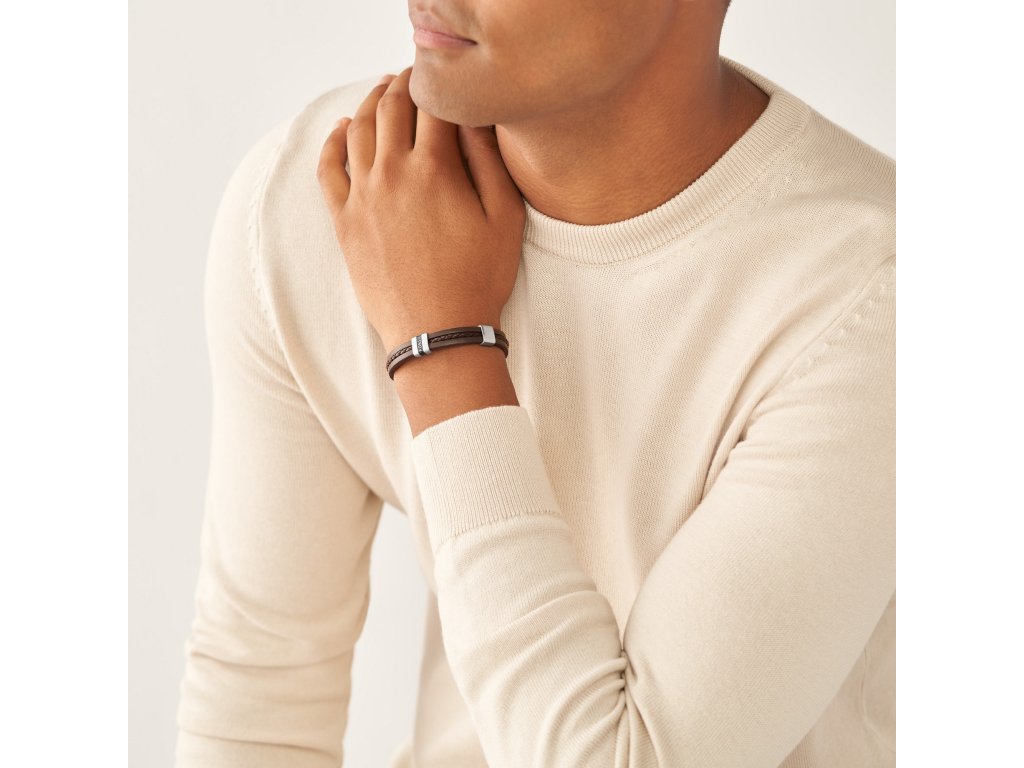 Náramek tvoří tři řemínky z hnědé kůže propojené ocelovými detaily do harmonického celku.