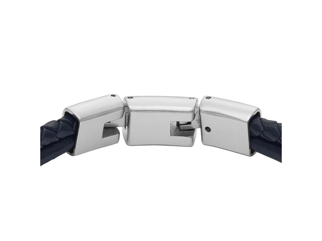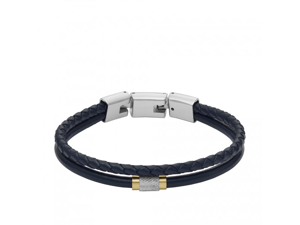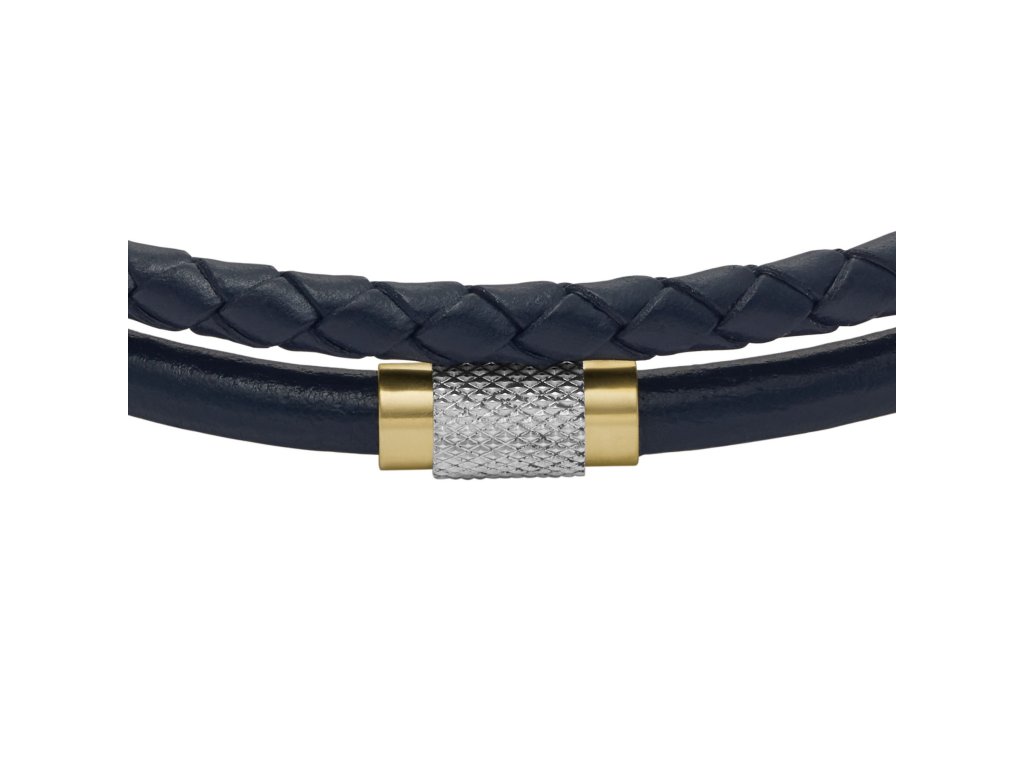 Pánský náramek All Stacked Up od Fossil je vyroben z tmavě modré kůže příjemného odstínu a tvoří jej dva řemínky, přičemž každý má jiný design. Ke kůži je pak v harmonickém kontrastu ocel, použitá v zapínání a jako dekorační prvek.