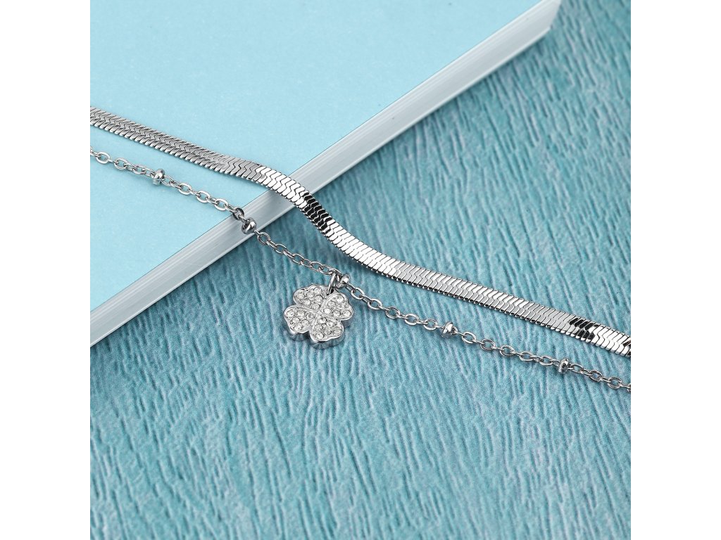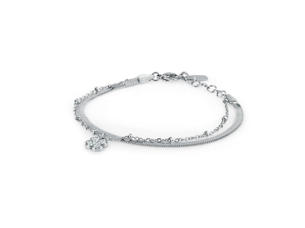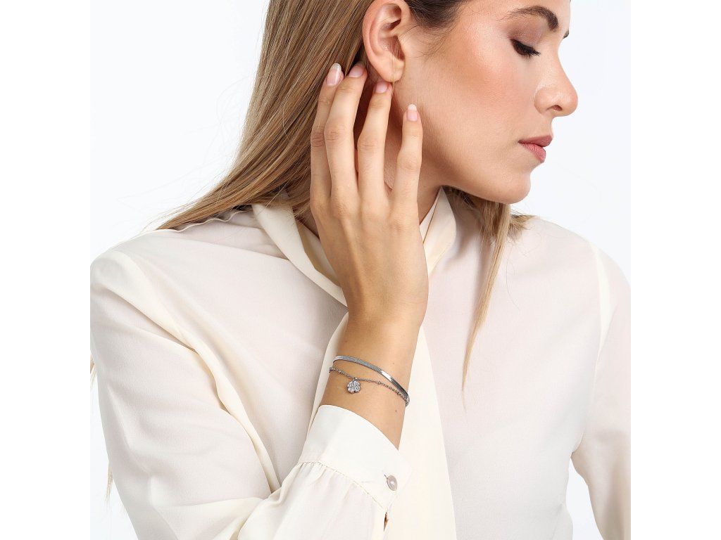 První náramek je jemný a zdobený přívěskem ve tvaru čtyřlístku a je osazen čirými krystaly pro extra třpyt. Druhý náramek je masivnější, což vytváří zajímavý vizuální kontrast a dává šperku výraznější vzhled.