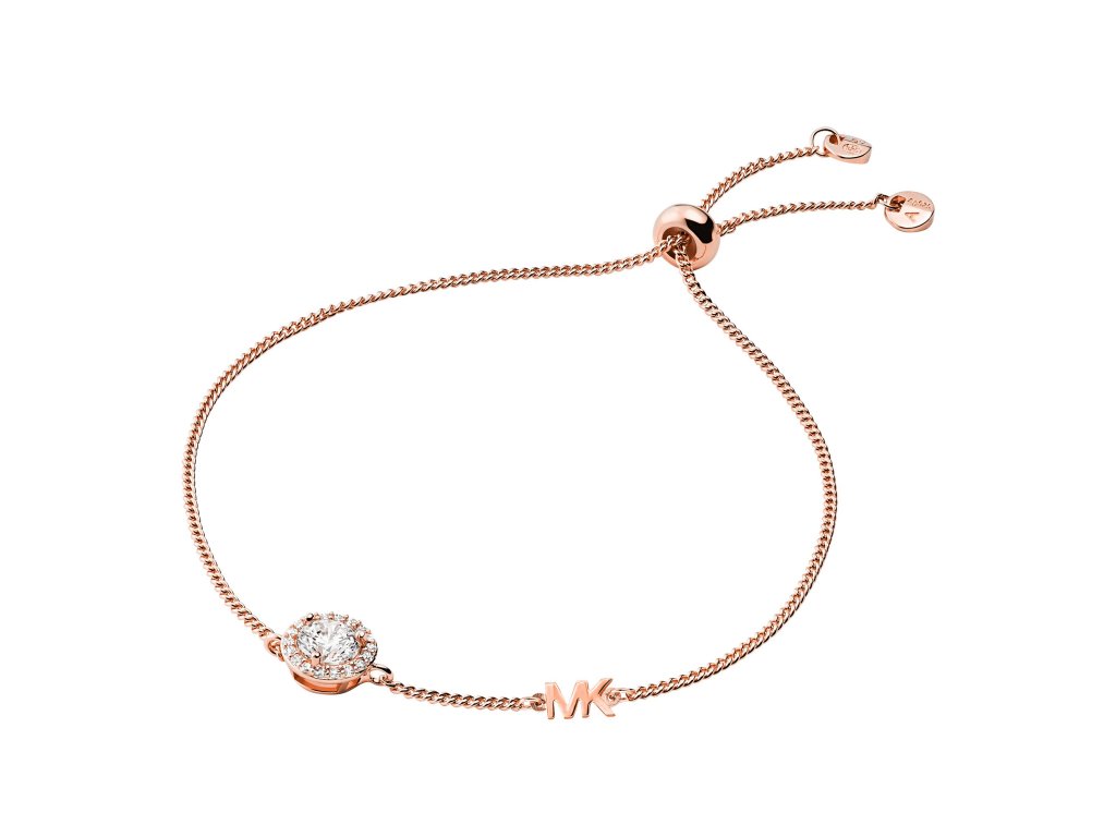 Náramek je vyroben ze stříbra v barvě růžového zlata. Zdobí jej logo MK po obvodu a kulatá ozdoba s několika třpytivými zirkoniemi. Jejich lesk, společně s barvou šperku, střídmým designem a kvalitním materiálem z něj dělá velmi ženský a nadčasový doplněk.