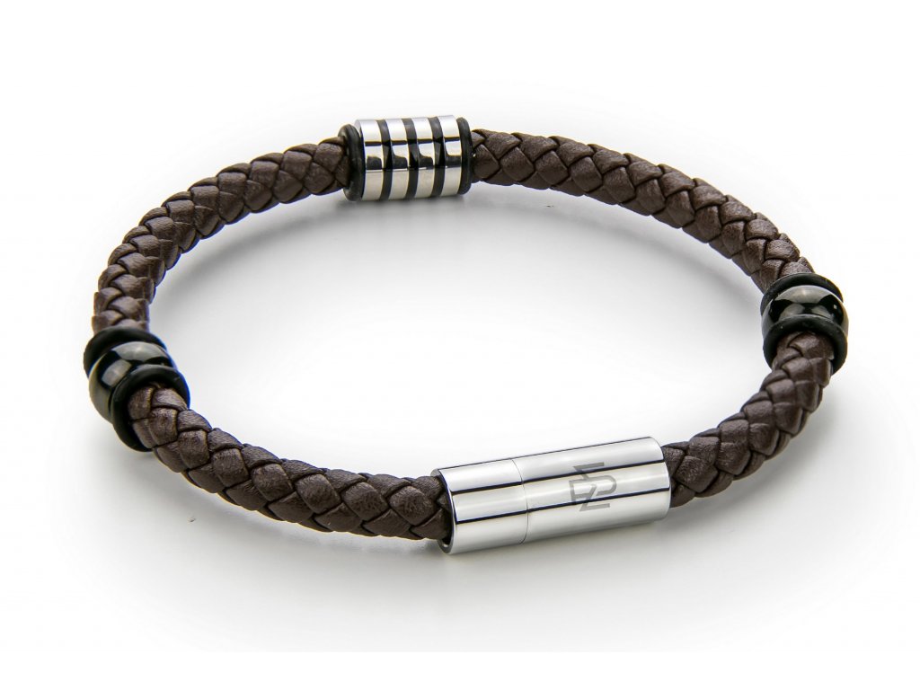 Kožený splétaný náramek v hnědé barvě zdobený dvěma korálky a dvěma stříbrnými válcovitými sponami z nichž jedna je s rýhami a druhá hladká a slouží jako zapínání na magnet.Doplňkové parametry