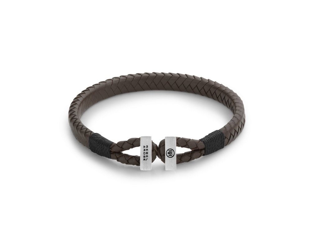 Hnědý kožený náramek, který je ozdobně proplétaný.